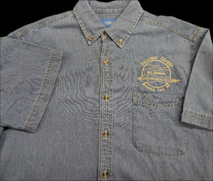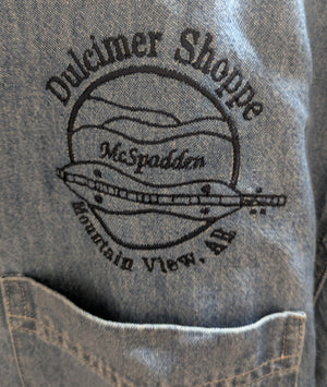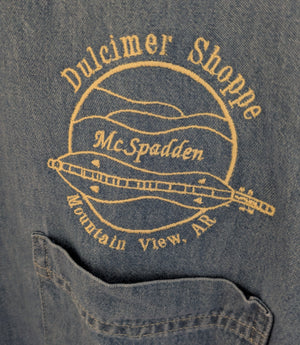 The short sleeve denim shirt with the Dulcimer Shoppe Logo embroidered on the front, left side.